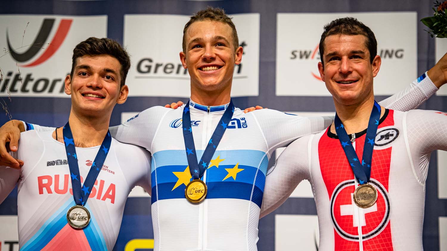 Starke Vorstellung vor Heimpublikum: Claudio Imhof (rechts) gewinnt an der EM 2021 in Grenchen Bronze in der Einzelverfolgung. Bild: Arne Mill