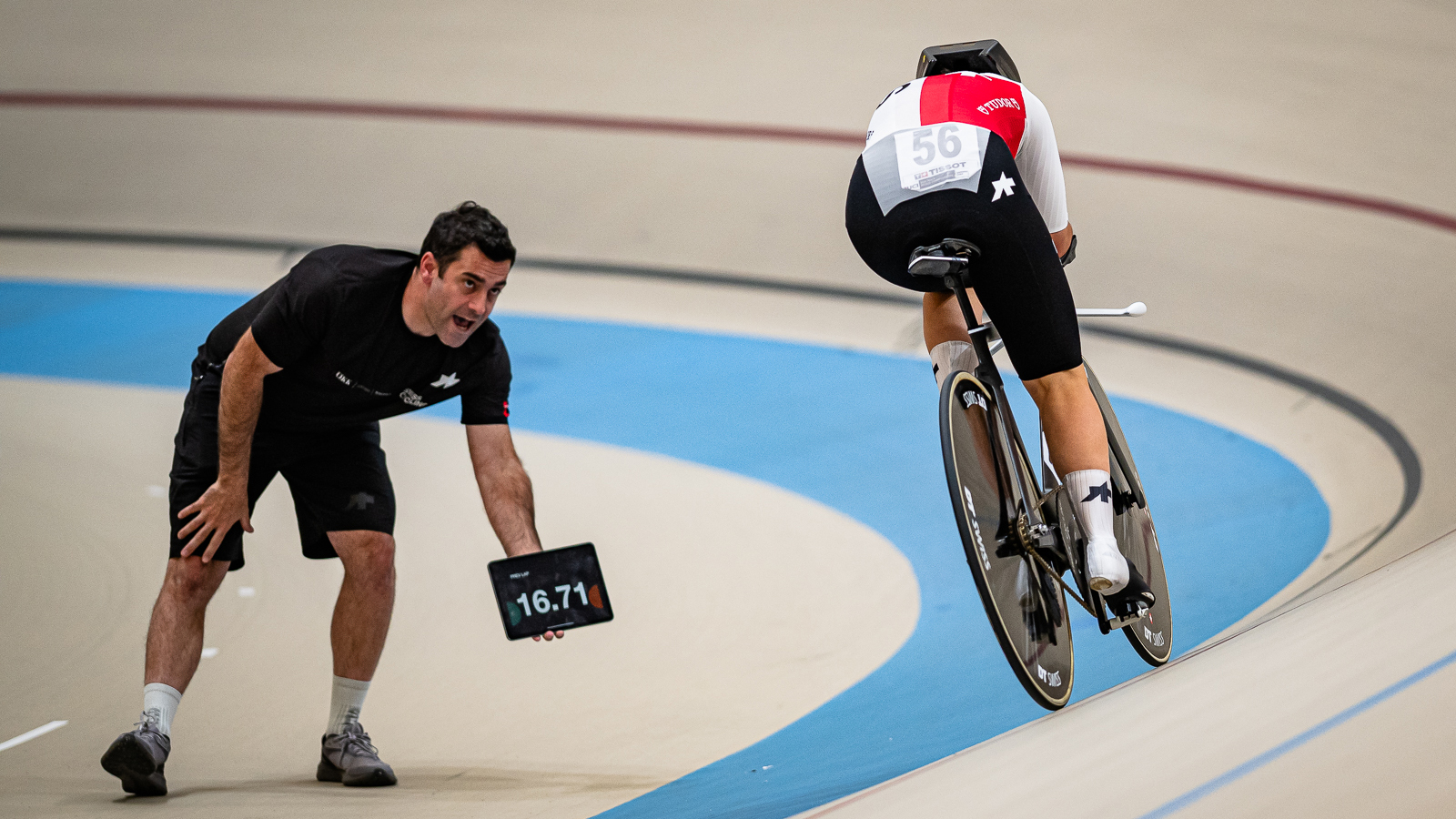 Jasmin Liechti (links Nationaltrainer Tristan Marguet) fährt Richtung Schweizer Rekord. Bild: Arne Mill