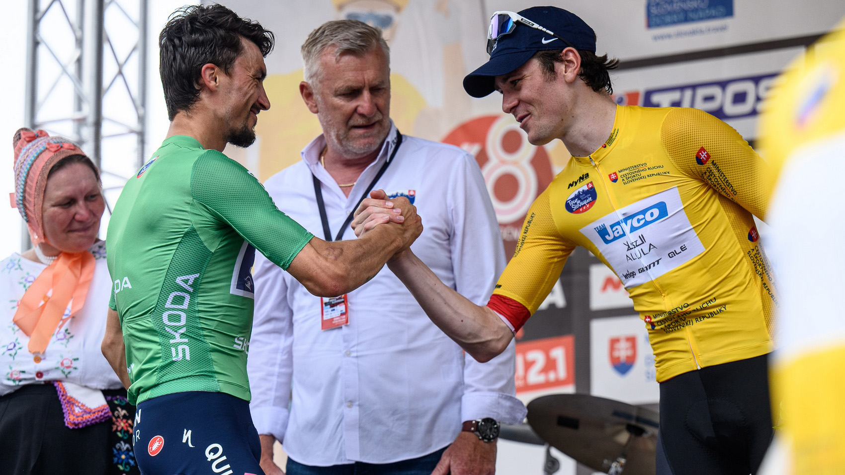 Gesamtsieger Mauro Schmid nimmt die Gratulation von Julian Alaphilippe entgegen. Bild: okoloslovenska.com