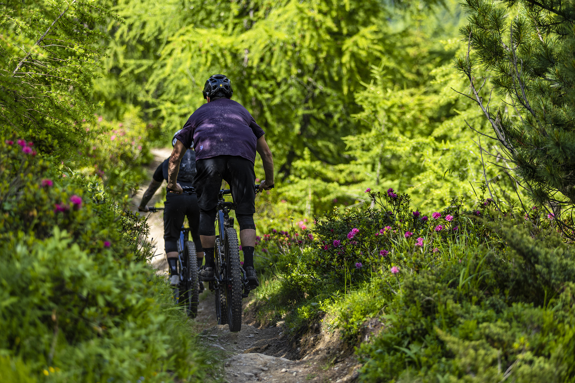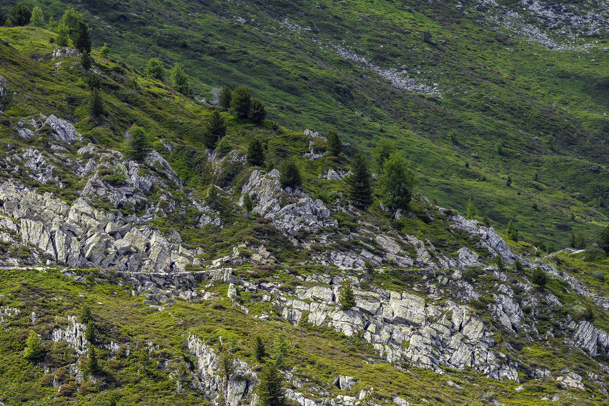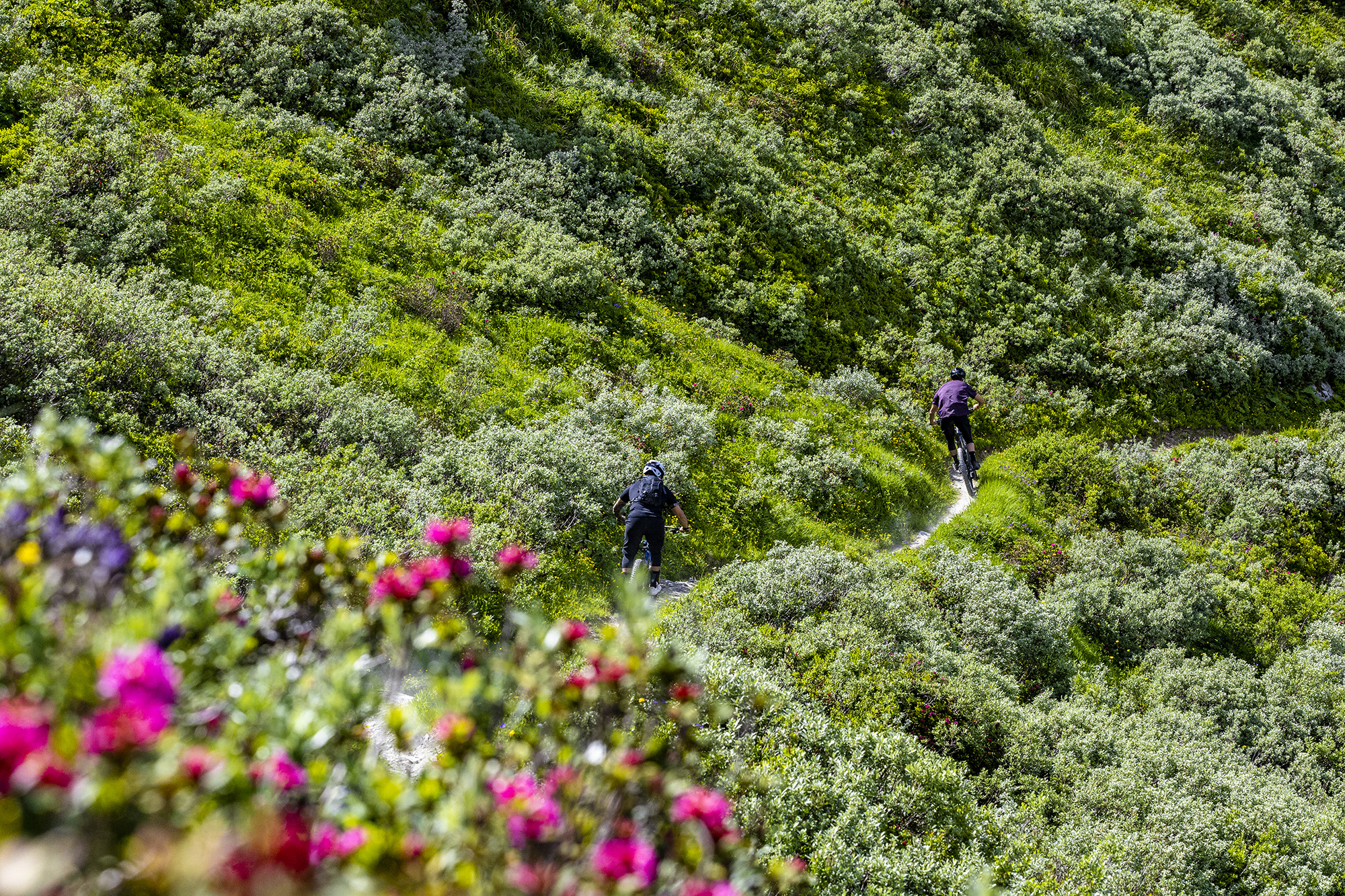 Diese grosse Tour vereint Single Trails und Flow Trails, die nicht nur atemberaubende Ausblicke auf Verbier bieten, sondern auch die Bergbahnen geschickt einbinden. Die Tour beginnt in Fontanay auf 2’500 m Höhe mit einer ersten Aufwärmrunde auf dem Flow Trail La Chaux „La Tsenelle“, bevor sie in Richtung Attelas auf 2’800 m weiterführt. Der Trail folgt dem Grat in Richtung Creblet, um dann zum Lac des Vaux hinunterzudroppen. Weiter geht es durch das Vallon d’Arby, ein wunderschöner und sehr langer Trail, der bis nach La Tzoumaz auf der anderen Seite von Verbier führt. In La Tzoumaz habt ihr die Möglichkeit, den Flow Trail „Chotatai“ zu fahren, eine super spassige und 5 km lange Strecke! Nachdem ihr wieder den Gipfel von Savoleyres erreicht habt, müsst ihr die La Planie nehmen, einen kleinen flachen Weg, der über Verbier hinwegführt, um zu den Ruinettes zu gelangen und wieder nach Fontanay hochzufahren. Es wird nun technisch anspruchsvoller mit einem Trail, der an der Cabane Mt-Fort vorbeiführt. Den besten Teil haben wir uns für das Ende aufgehoben: die grosse Abfahrt auf dem berühmten Trail „Vertigo“, der sich bis ins Tal schlängelt.