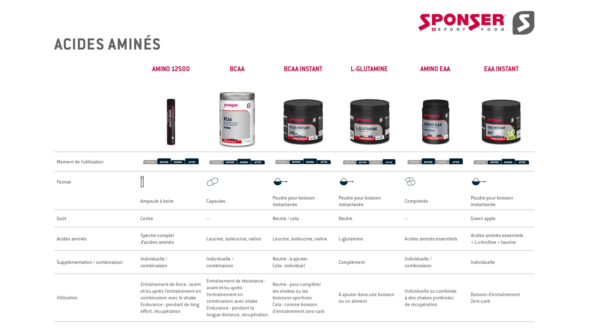 Le fabricant suisse SPONSER, partenaire nutritionnel officiel de Swiss Cycling, propose une large gamme d’acides aminés destinés aux sportives et sportifs. Cliquer ici pour découvrir les produits aminés de SPONSER.