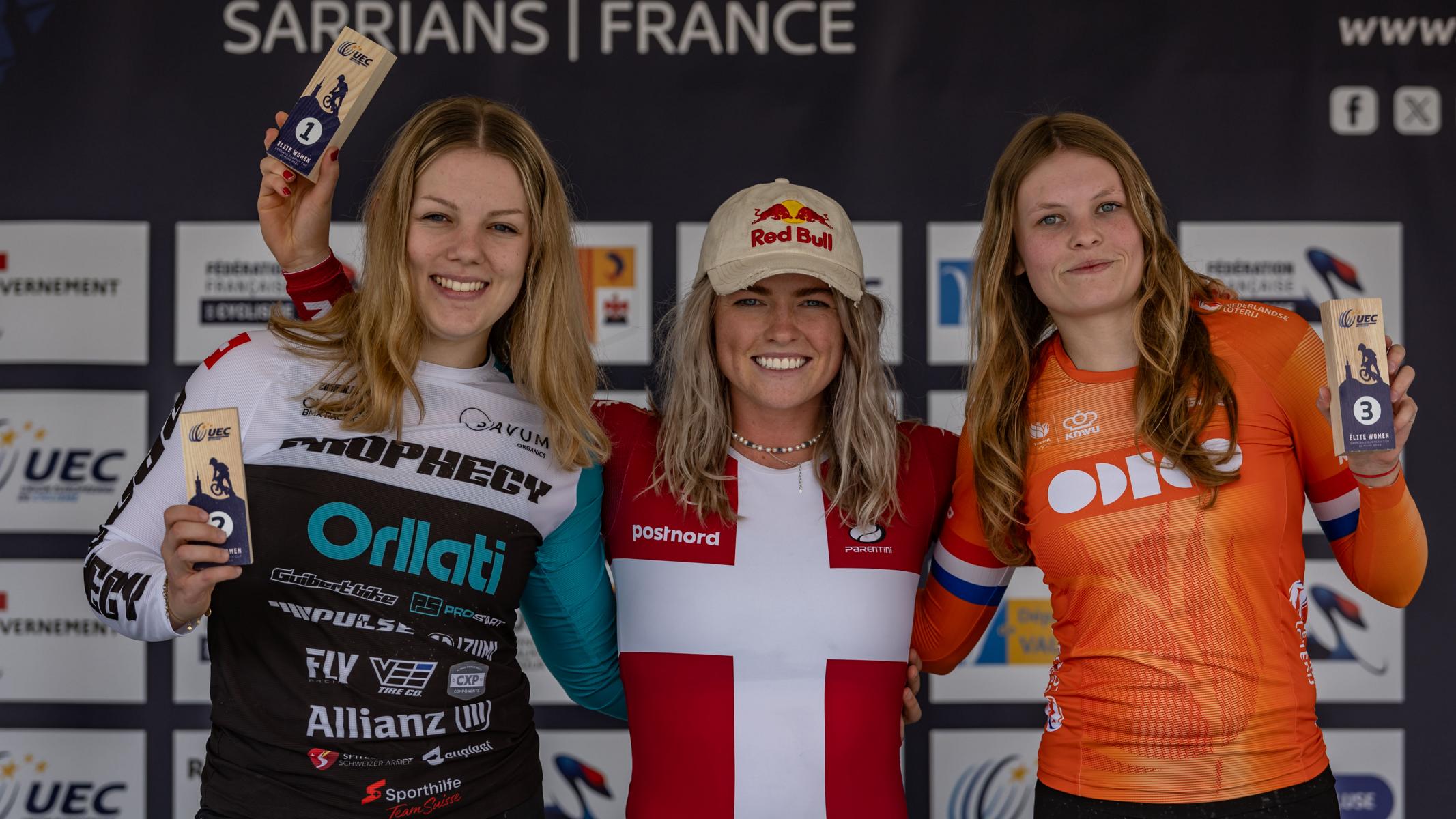 Nadine Aeberhard (à gauche) avec la gagnante Malene Kejlstrup (au centre) et la troisième, Michelle Wissing. Image: Nico van Dartel
